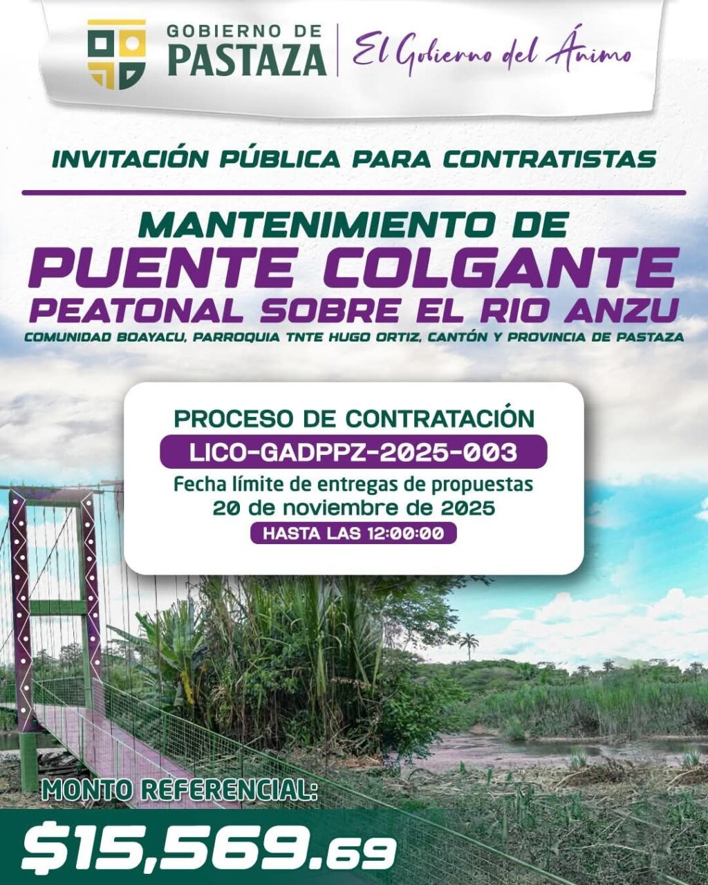 MANTENIMIENTO DE PUENTE COLGANTE PEATONAL SOBRE EL RIO ANZU – COMUNIDAD BOAYACU, PARROQUIA TNTE HUGO ORTIZ, CANTÓN Y PROVINCIA DE PASTAZA, al siguiente link: https://www.compraspublicas.gob.ec/…/informacionProceso.