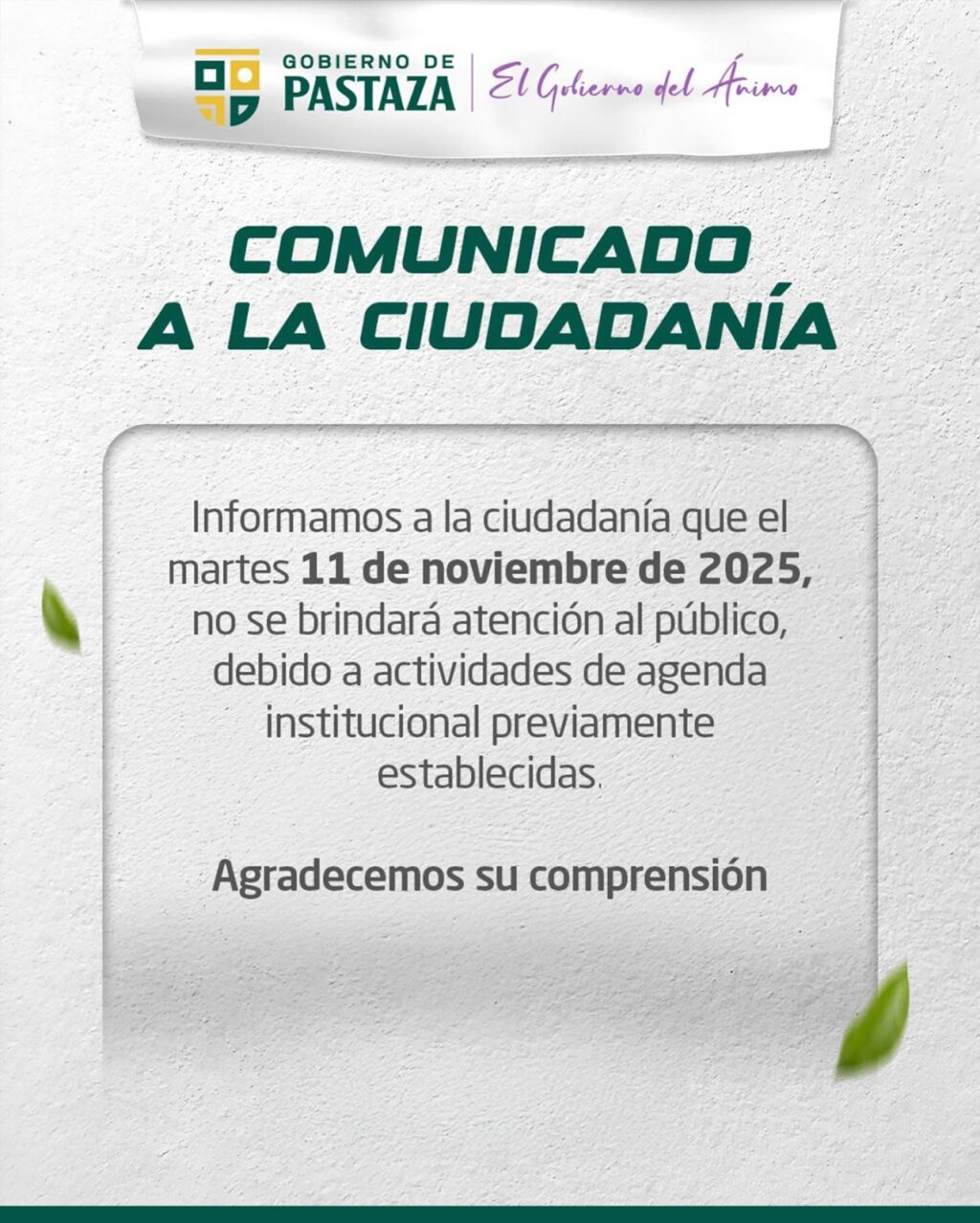 Noticias Comunicado 10 noviembre, 2025 0 Navegación de entradas Previous: En vivo: Sesión Solemne conmemorativa por los 66 años de provincialización de PastazaNext: Desfile cívico y militar por los 66 años de provincialización de Pastaza Más historias Noticias Una obra por semana en Pomona 12 enero, 2026 0 Noticias El 2025 despedimos con obras y el gran cariño para Pastaza 31 diciembre, 2025 0 Noticias INVITACIÓN PÚBLICA PARA CONTRATISTAS 30 diciembre, 2025 0 Deja una respuesta Cancelar la respuestaTu dirección de correo electrónico no será publicada. Los campos obligatorios están marcados con *Comentario * Nombre * Correo electrónico * Web Guarda mi nombre, correo electrónico y web en este navegador para la próxima vez que comente.