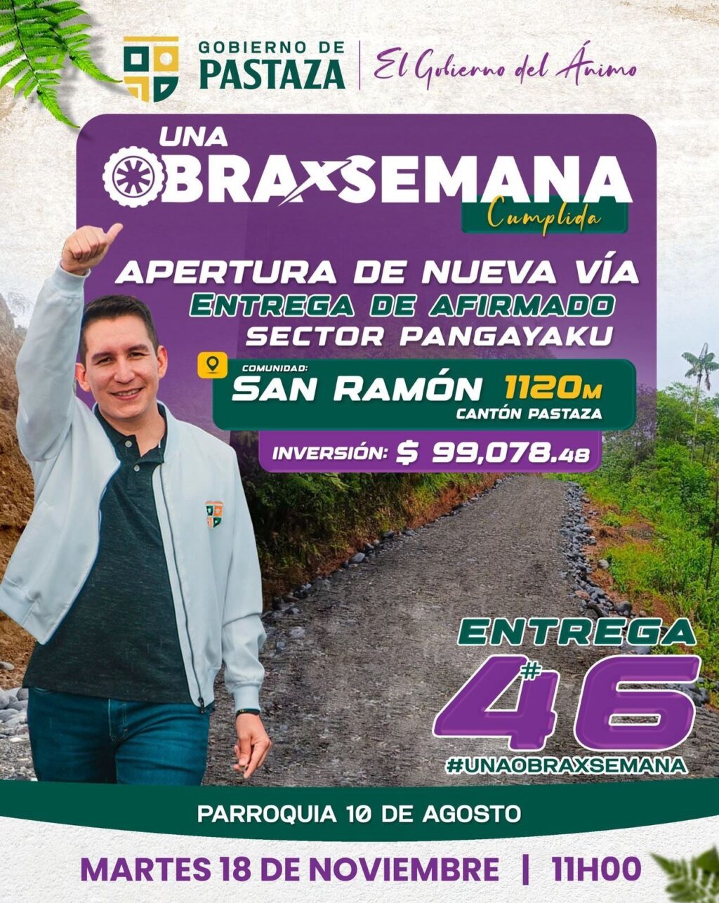 Noticias Sin detenerse ! Se abre una nueva vía en San Ramón 17 noviembre, 2025 0 Navegación de entradas Previous: 𝗜𝗡𝗩𝗜𝗧𝗔𝗖𝗜𝗢́𝗡 𝗣𝗨́𝗕𝗟𝗜𝗖𝗔Next: Dos ferias en una sola jornada para apoyar a nuestros productores. Más historias Noticias Una obra por semana en Pomona 12 enero, 2026 0 Noticias El 2025 despedimos con obras y el gran cariño para Pastaza 31 diciembre, 2025 0 Noticias INVITACIÓN PÚBLICA PARA CONTRATISTAS 30 diciembre, 2025 0 Deja una respuesta Cancelar la respuestaTu dirección de correo electrónico no será publicada. Los campos obligatorios están marcados con *Comentario * Nombre * Correo electrónico * Web Guarda mi nombre, correo electrónico y web en este navegador para la próxima vez que comente.
