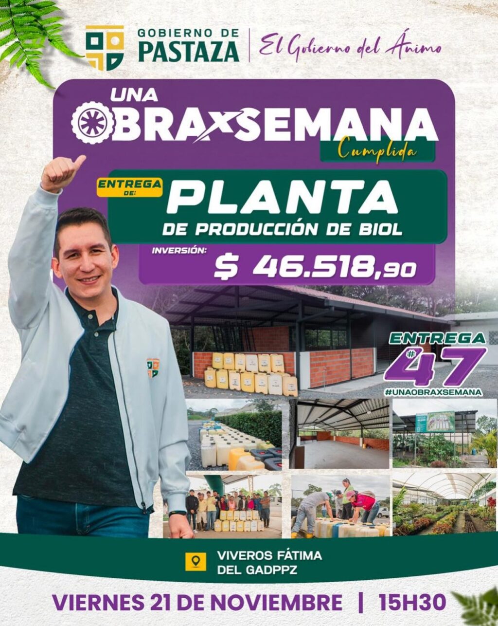 Noticias Vamos por la 47 de Una Obra X Semana 20 noviembre, 2025 0 Navegación de entradas Previous: Afirmado de vía en el sector YaguajeNext: Video: La Sonora Dinamita junto a Daniel Calderón y los Gigantes del Vallenato en Pastaza Más historias Noticias Una obra por semana en Pomona 12 enero, 2026 0 Noticias El 2025 despedimos con obras y el gran cariño para Pastaza 31 diciembre, 2025 0 Noticias INVITACIÓN PÚBLICA PARA CONTRATISTAS 30 diciembre, 2025 0 Deja una respuesta Cancelar la respuestaTu dirección de correo electrónico no será publicada. Los campos obligatorios están marcados con *Comentario * Nombre * Correo electrónico * Web Guarda mi nombre, correo electrónico y web en este navegador para la próxima vez que comente.